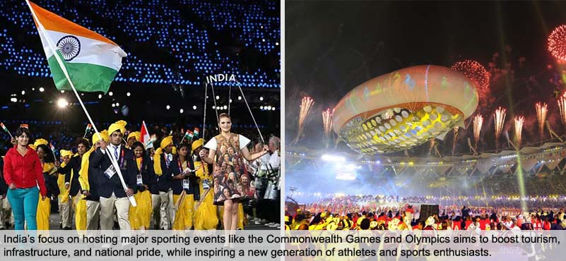 India’s focus on hosting major sporting events like the Commonwealth Games and Olympics aims to boost tourism, infrastructure, and national pride, while inspiring a new generation of athletes and sports enthusiasts.